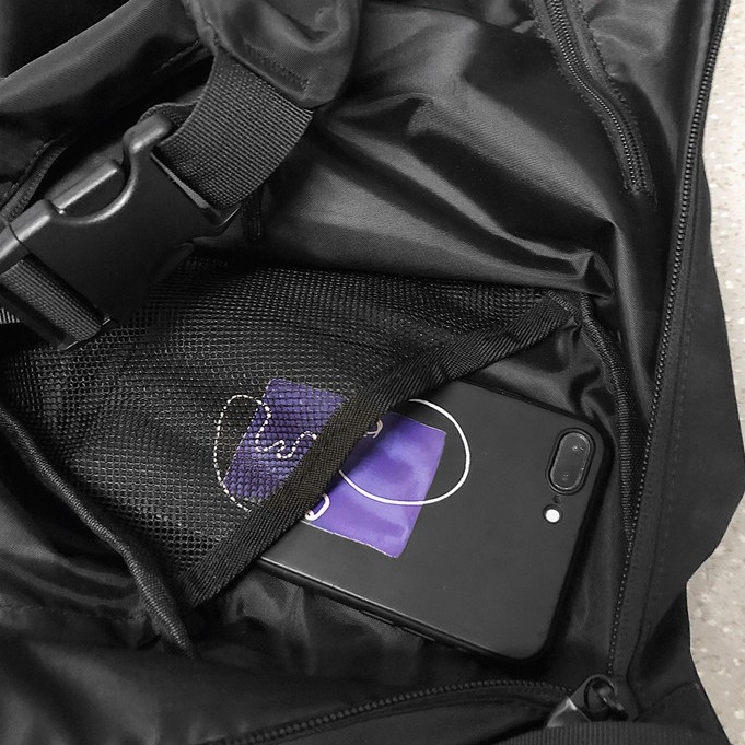 It looks pretty cool and I like that the material doesn't get wet too easily to protect my belongings.There is a small-sized pouch attached to it.Great buy!