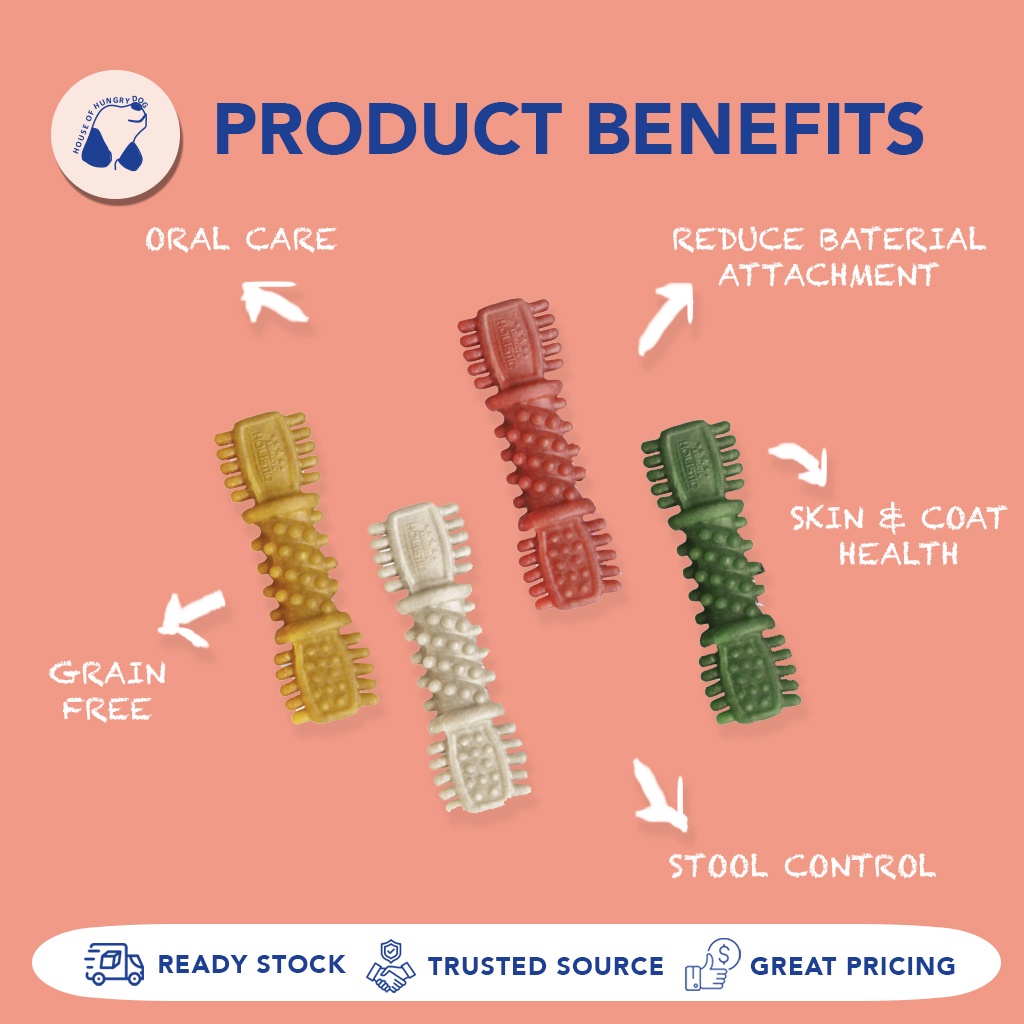 Suitability:good Quality:good Performance:good Fast delivery, items received in good condition with long expiry dates. Love that we can mix and match the diff flavours. My doggo’s fav brand of dental chew